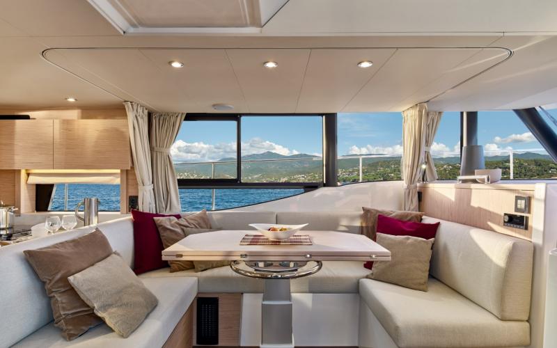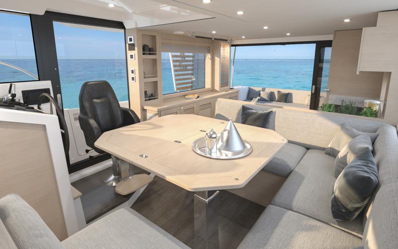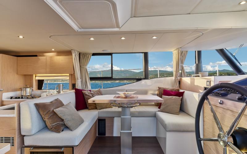 De buffetkast kan worden uitgerust met een ijsmachine, Villeroy & Boch serviesgoed en een verlichte glaswerkkast erboven. Voor de kombuis is een grote verhoogde U-vormige dinette met ruime zitplaatsen voor maximaal acht personen met een geweldig uitzicht rondom. In de zitplaats is ruimte voor een wijnkoeler met 23 flessen. Aan bakboord biedt de grote opbergruimte plaats aan een 40" TV.