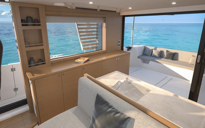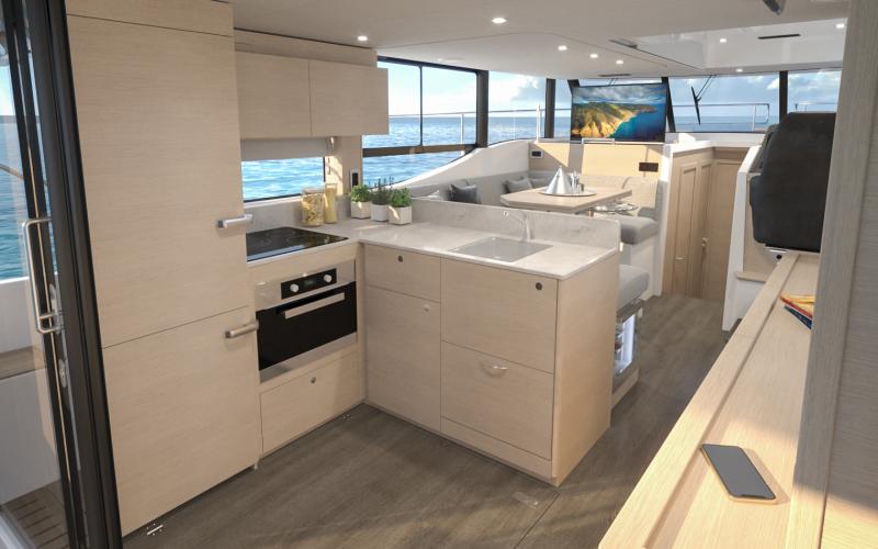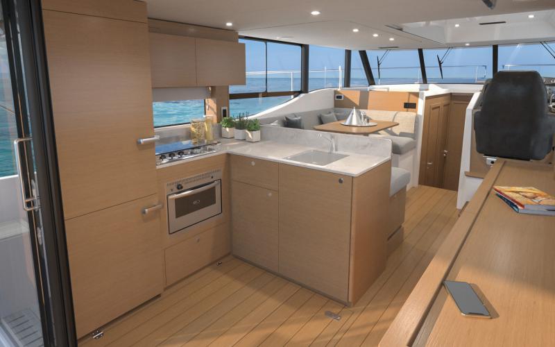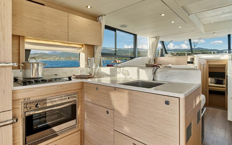 Bij binnenkomst door de openslaande deuren is er een grote L-vormige kombuis aan bakboordzijde met een 255-liter koelkast met vriesvak en riante hoge opbergkasten. De standaard kombuis heeft een gasoven of optionele multifunctionele elektrische oven, een slimme "magische hoek" uittrekbare opbergkast, kasten en laden die voldoende capaciteit garanderen voor langdurig cruisen terwijl er nog steeds ruimte is voor een optionele vaatwasser. Het Corian werkblad heeft een gas- of inductiekookplaat en een grote spoelbak. Tegenover de kombuis is een ruime buffetkast met geïntegreerd flessenrek.