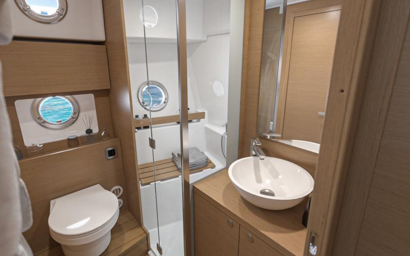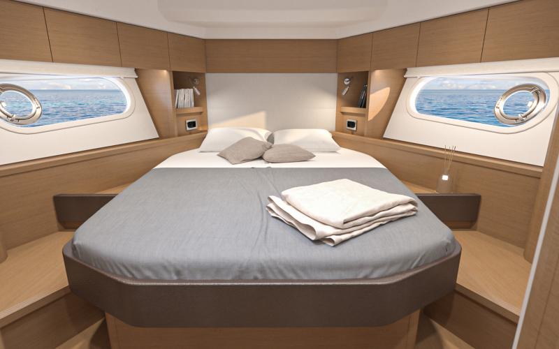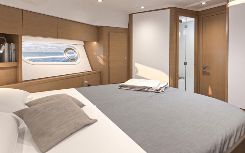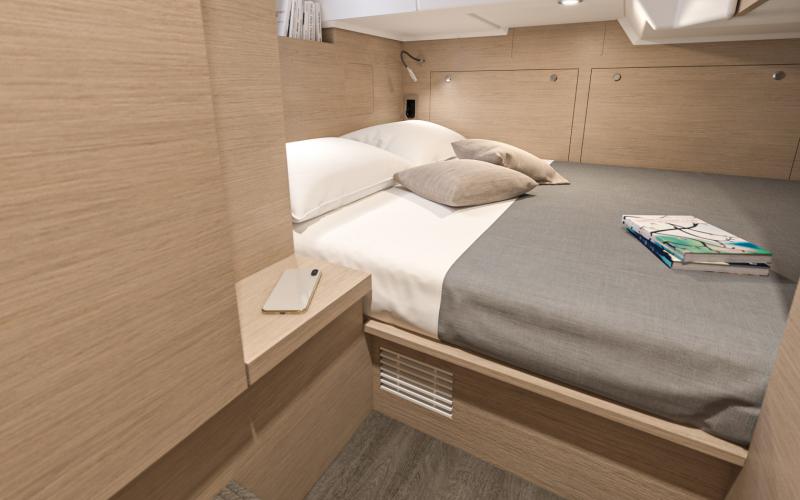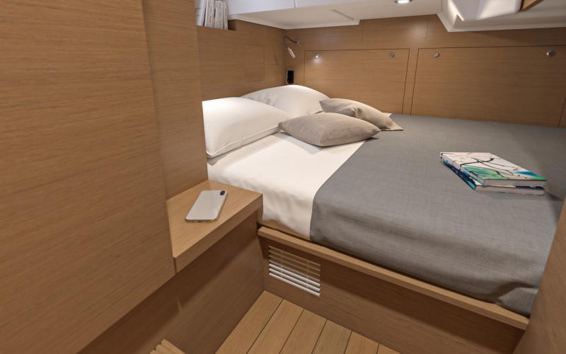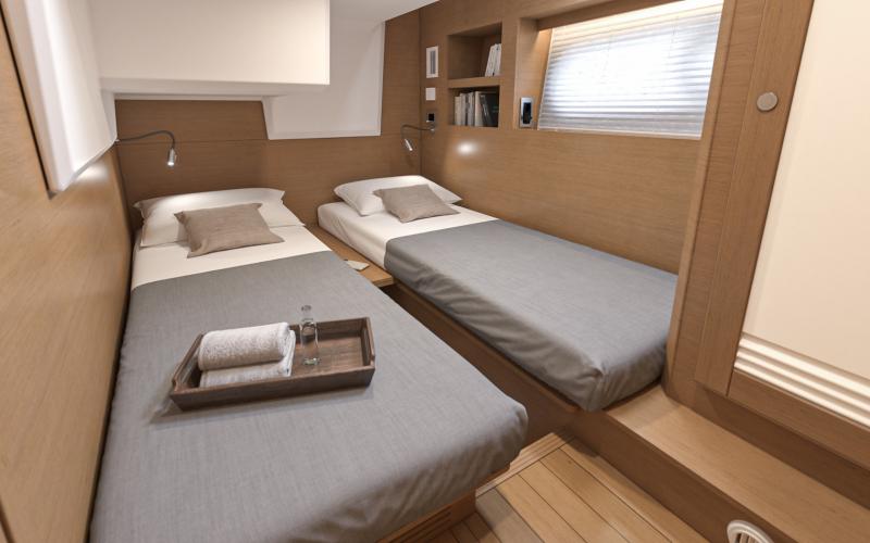 De voorkajuit is voorzien van een tweepersoonsbed dat omhoog kan worden geklapt voor veel bergruimte. Er zijn hoge kasten rijen en lage kasten, grote ramen met ingebouwde patrijspoorten en een luik dat de voorkajuit van veel natuurlijk licht en ventilatie voorziet. De en-suite badkamer heeft een aparte douchecabine met een teakhouten zitje. De gastenhut aan bakboord is voorzien van een groot raam met inzetraam, opbergruimte, kledingkast en twee 1-persoonsbedden met een vulstuk om er een tweepersoonsbed van te maken. Deze hut heeft ook een en-suite deur naar de bakboord natte cel - waar u ook een aparte douchecabine met teak latten zitting vindt. De stuurboord gastenhut heeft twee patrijspoorten, een dwars dubbel bed en een dubbele kast die groot genoeg is om een optionele wasmachine/droger in te plaatsen.