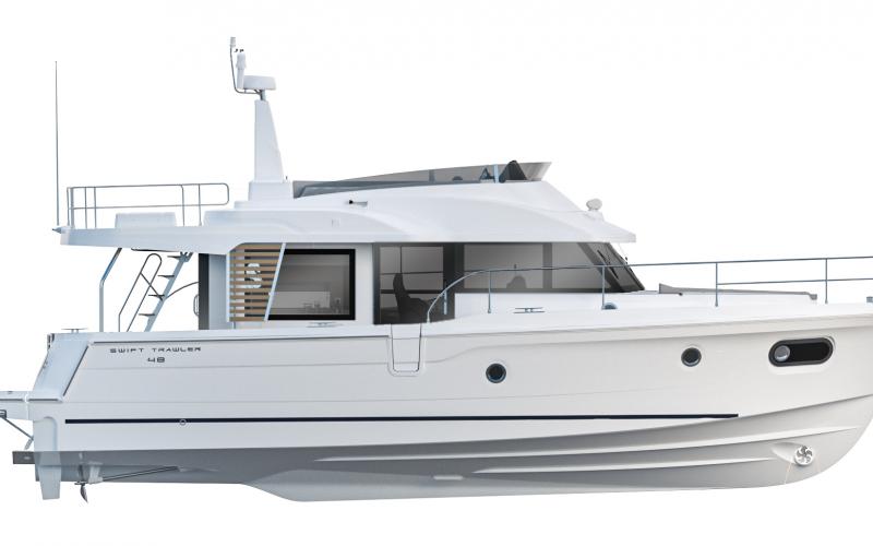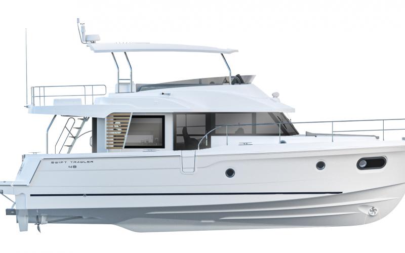 De nieuwe Swift Trawler 48 is passend geplaatst in de 45+ voet lange afstand zeiler categorie, deze mid-range motorboot heeft een opvallend stijlvol profiel, onder andere voorzien van de verchroomde rvs omlijste teak platen, ook toegepast op het nieuwe Grand Trawler 62 vlaggenschip.